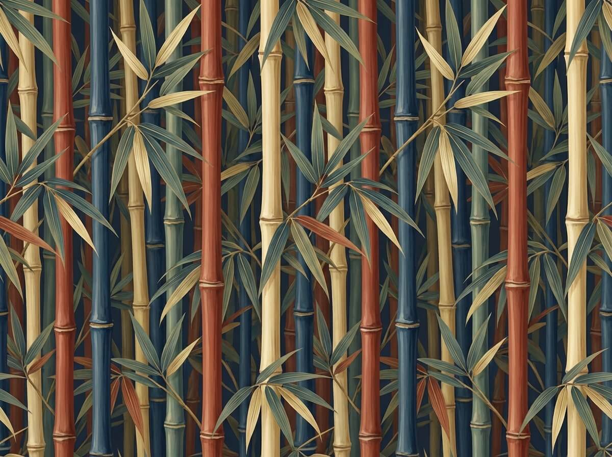 A sophisticated blend of deep reds, golds, and teal.